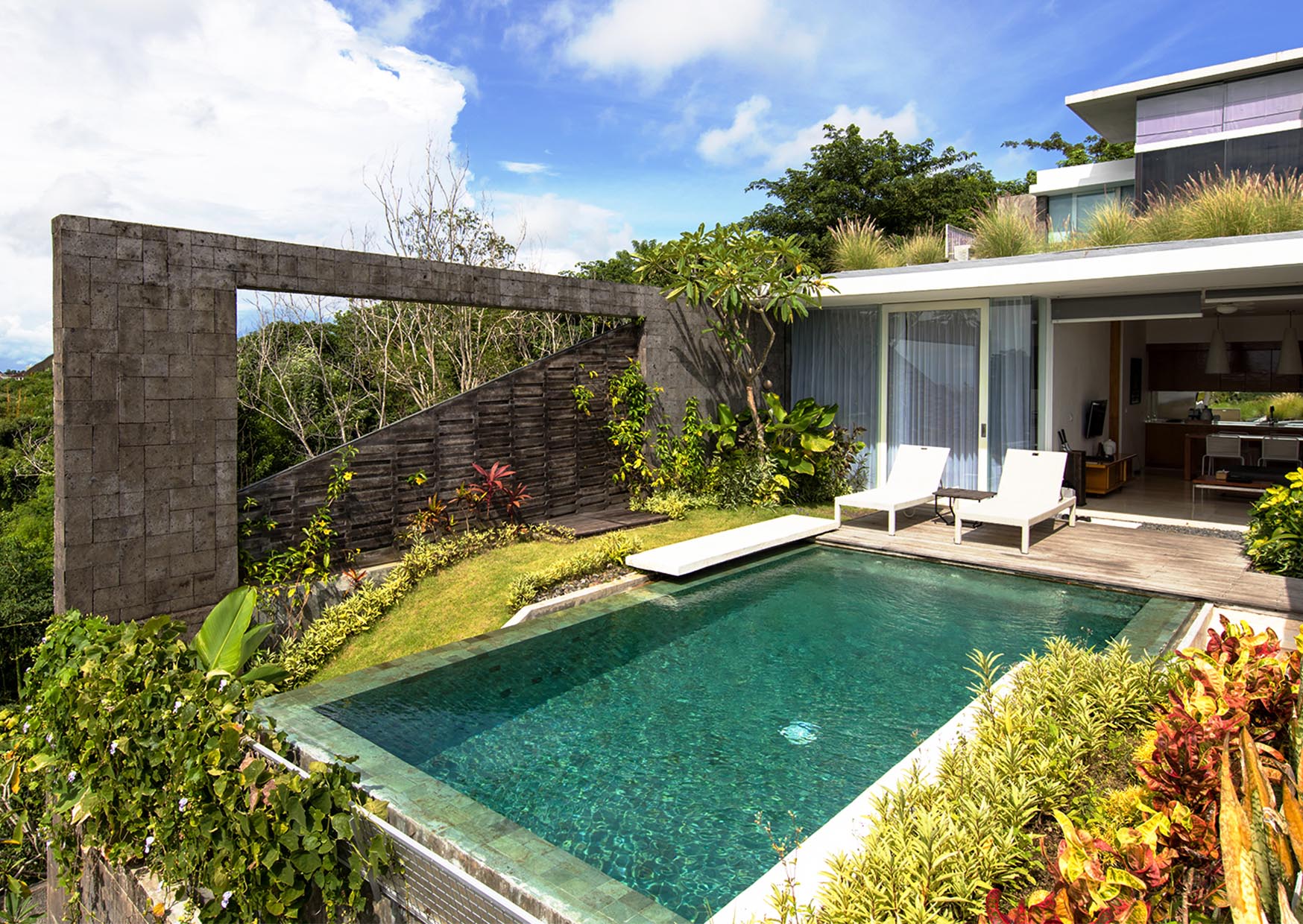 A separate open living and dining room extends to a spacious ironwood deck and private pool, which overlook the rooftop gardens and Uluwatu hillside vistas.
